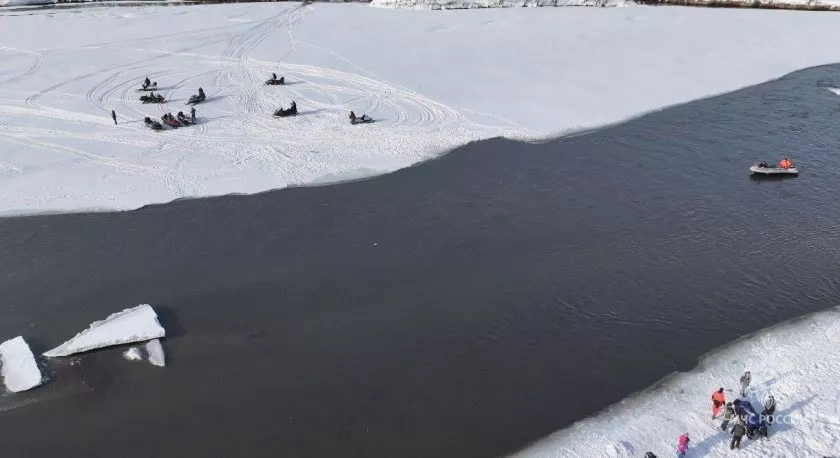 «Прибыв на место, спасатели на лодке переправили через реку девять человек с личными вещами. После этого обеспечили безопасность при самостоятельной переправе водителям девяти снегоходов», - указано в материале.
